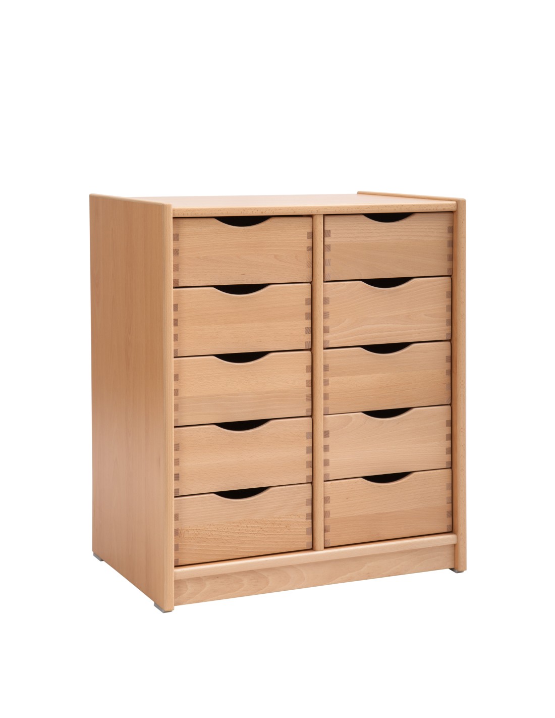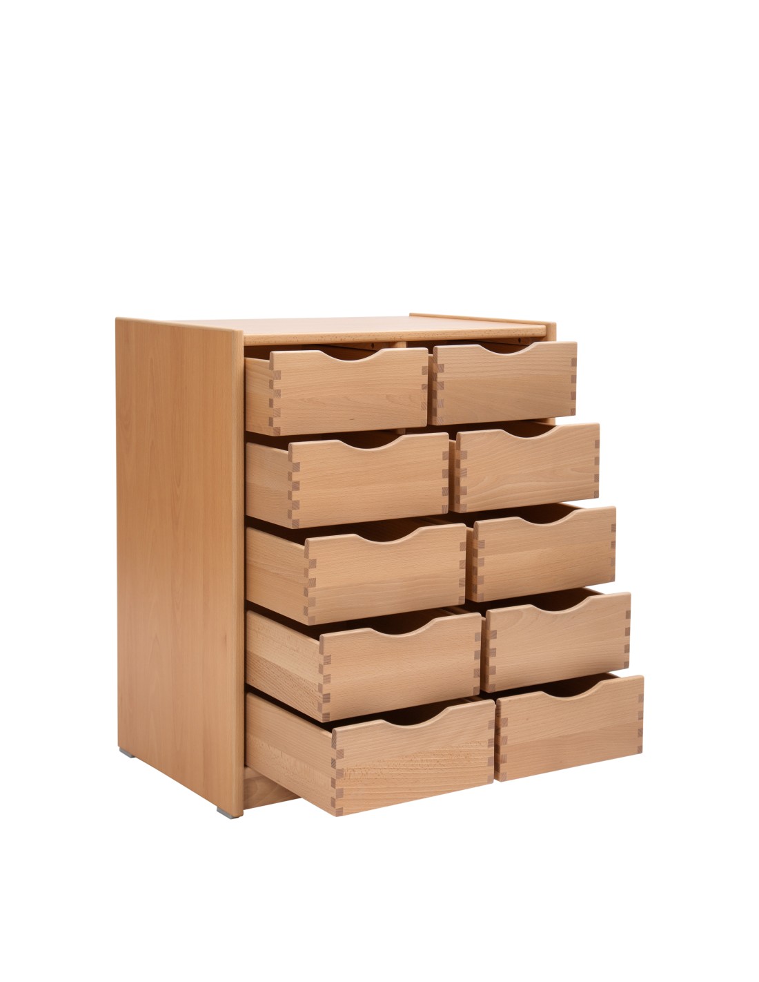 Dulapul de depozitare cu două rânduri este o piesă esențială pentru orice sală de grădiniță care dorește să combine estetica modernă cu utilitatea practică. Oferind spațiu amplu în cele 10 cutii, acest dulap este soluția ideală pentru a păstra ordonate și la îndemână materialele didactice diverse. Fabricate din lemn masiv de fag și finisate ecologic, cutiile sunt rezistente în timp. Structura dulapului din PAL melaminat, în nuanța caldă de fag și canturi bordurate din lemn masiv lăcuit, aduce un plus de naturalețe și căldură în orice mediu educațional. *Se recomandă ștergerea produsului cu o cârpă moale, curată, înmuiată în soluție pentru mobilier. Nu se folosesc pentru curățare și întreținere agenți chimici sau abrazivi, alcool, petrol, gaz, spirt. Nu se folosesc obiecte dure.